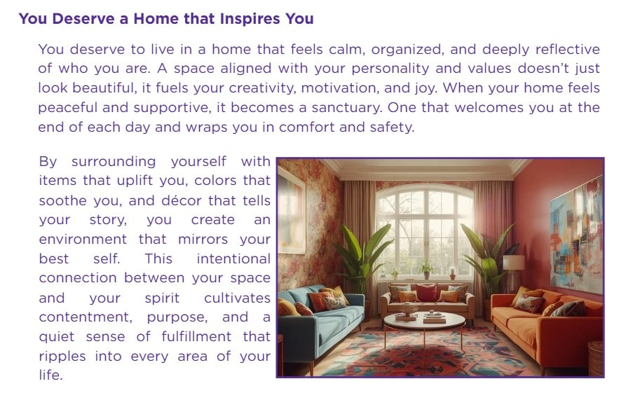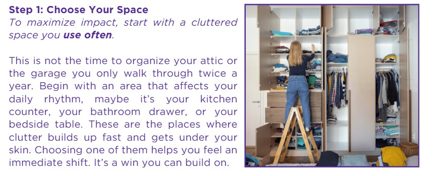 - Physical Decluttering Tools: four simple steps to organize any space, product suggestions, and reset rituals.